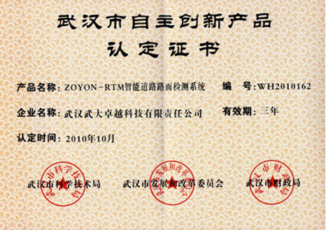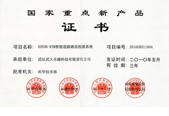 ?武漢武大卓越科技有限責(zé)任公司(以下簡稱“卓越科技”)的主打產(chǎn)品——ZOYON-RTM智能道路路面檢測系統(tǒng)(簡稱RTM道檢系統(tǒng))榮獲國家科技部授予的“2010年國家重點新產(chǎn)品”光榮稱號!2011年1月11日武漢市科技局組織武漢市十大科技專項推進(jìn)工作表彰大會進(jìn)行了頒獎、授牌!
