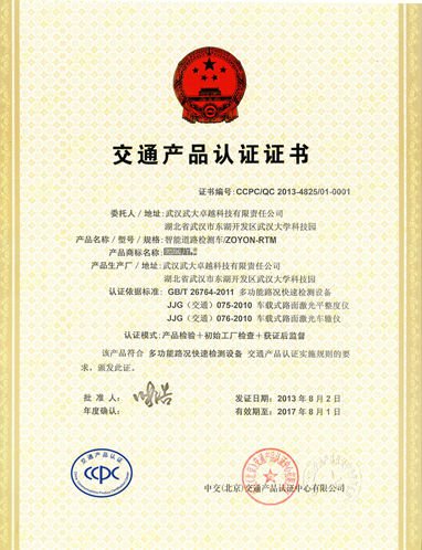 2013年8月2日,武漢武大卓越科技有限責(zé)任公司獲得由中交(北京)產(chǎn)品認(rèn)證中心有限公司頒發(fā)的交通產(chǎn)品認(rèn)證證書(shū)。此次認(rèn)證是對(duì)卓越科技產(chǎn)品在道路養(yǎng)護(hù)行業(yè)的實(shí)力又一次肯定。